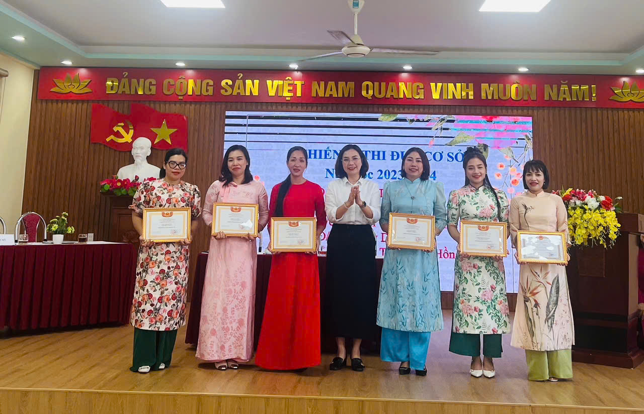 Cũng tại Hội nghị các đồng chí cán bộ, giáo viên được biểu dương danh hiệu Chiến sĩ thi đua cơ sơ, giấy khen của UBND quận, đoàn viên công đoàn xuất sắc cũng vinh dự được đồng chí Nguyễn Thị Vân Anh - Nhà giáo ưu tú, Quận ủy viên, Trưởng phòng GDĐT trao khen, chúc mừng.